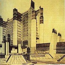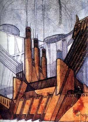 何とも過激な宣言文ではあるが、これが当時の先進的な時代気分であった。そして第一次世界大戦に突入していった。このグループの建築家の一人にコモ出身のアントニオ・サンテリアがおり、1914年に「未来派建築宣言」を出して、『チッタ・ヌオーヴァ(新都市)』と題した幾つかのドローイング(Fig.02-04)を発表した。それらは第一機械時代の美学を表現していた。彼はそのほとばしる才能を開花させるまえに、戦場で没した。