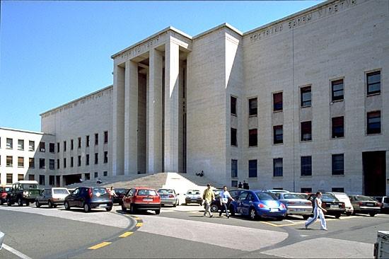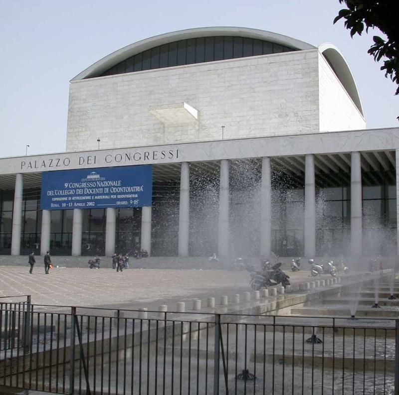 ムッソリーニの御用建築家となったマルチェッロ・ピアチェンティーニはノヴェチェントとイタリア合理主義建築を折衷したと言われる新古典主義建築を推進し、数々の建築(Fig.11)を残した。さらに、ムッソリーニはファシスト政権20周年記念の祝祭として1942年にローマ万国博覧会を企画し、ピアチェンティーニにその立案(Fig.12)を委ねた。諸施設の計画には設計競技が実施され、その中に四角のコロッセオと俗称されるイタリア文明館(Fig.13)やアダルベルト・リーベラの設計による会議場(Fig.14)等があった。ところが計画なかばに第2次世界大戦が勃発し、万国博は中止され、工事も中断された。終戦後、これらの施設の幾つかが再開され完工した。現EUR地区のそれらの建築を見ると、ファシズム政権が創造しようとした都市をイメージ想像することができる。