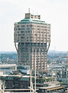 戦後の建築・デザイン界はモダニズム建築(イタリア合理主義建築)の再評価と戦前のモニュメンタリズムの後遺症意からの脱却を課題とした。そして幾多の有能な建築家たちの創作活動が開花しイタリアにおける建築・デザイン界の黄金時代を迎える。建築家は建築の仕事のみならず、プロダクトデザインの分野においても主役を演じた。このことはイタリアンデザインの重要な特質として上げることができる。また、イタリアンデザインの隆盛への舞台作りおいて、ミラノのデパート(リナシェンテ)が1954年に創設したデザイン賞であるコンパッソ・ドーロ(黄金コンパス)賞の貢献を見落としてはならない。60年代・70年代はイタリア建築・デザイン界の黄金時代であり、幾多の巨匠を輩出した。彼等を列記すれば;フランコ・アルビーニ、ジオ・ポンティ、ピエール・ルイジ・ネルヴィ、B.B.P.R、カルロ・スカルパ、アンジェロ・マンジャロッティ、ガエ・アウレンティ、アキッレ・カスティリオーニ、ヴィーコ・マジストレッティ、ジャン・カルロ・デカルロ、ヴィットリオ・グレゴッティ等々。ここでは彼等の代表作をすべて紹介する余裕は無いが、なかんずくミラノにある2つの摩天楼を取り上げたい。一つはミラノ中央駅のそばに建つジオ・ポンティとピエール・ルイジ・ネルヴィ他の共作によるピレッリ・ビル(1956-61,Fig.15)。そしてもう一つはミラノ大聖堂のそばに聳えるB.B.P.R設計のトッレ・ヴェラスカ(1956-58,Fig.16)である。前者は当時の主流であったモダニズム建築(インターナショナルスタイル)の秀作である。後者は明らかにインターナショナルスタイルに対する異議を表明しており、その形態にはロンバルディア地方の建築言語を採用して地域固有の歴史と文化との連続性が表現されている。これはノヴェチェントの再生として捉えることもできる。そして、アルド・ロッシ(Fig.17)が登場してノヴェチェントがふたたび復活した。