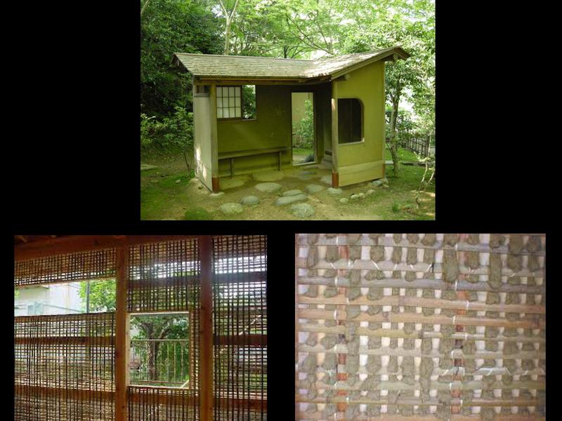 これは、伝統的建築様式の一つ「数寄屋造り」の一例です。この壁は左下に見るような、柱の間に竹を割って麻紐等で組んだ下地に、右下に見える土と藁を捏ねたものを両面から塗りこんで、上の写真のような壁にします。現代でも田舎の一部の家作にはこの伝統工法が用いられています。この土壁は調湿効果もあり、すぐれて健康的な素材であるとともに、地震に対しても、有効な働きをします。つまり、この土壁が壊れることで、地震力を吸収する働きをします。壊れても、後で容易に修復する事ができるので、持続性にも優れています。この壊れることで地震力を吸収するという発想は、きわめて日本的といえます。