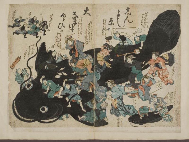 これは1855年に江戸(現在の東京)に発生した大地震の後に、巷で流布した『鯰絵』というものの1例です。当時、地震は大鯰が地下で暴れることで起こるという民間信仰がありした。この大地震の後に、風景画であり風刺画でもあったこのような鯰絵がたくさん描かれました。現在確認されているものでも250点を超えています。この絵に描かれているのは、地震のためにひどい目にあった庶民が大鯰を懲らしめている図で、とりわけ遊郭の遊女たちが怒り狂っています。