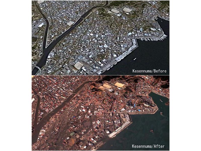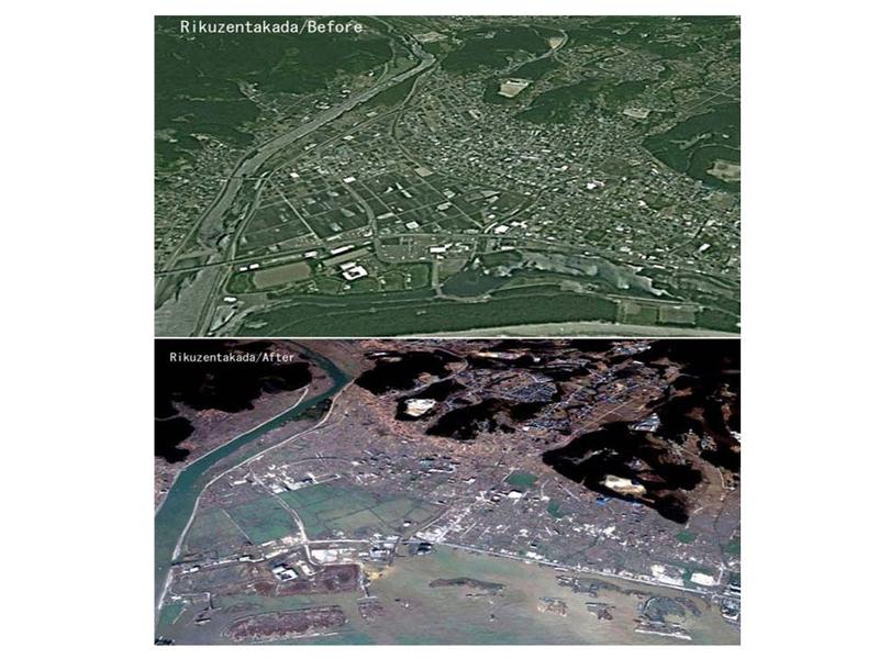 このスライド[Fig.8]は被災地のひとつ陸前高田の被災前と被災後の衛星写真です。次[Fig.9]をお願いします。これは別の被災地、気仙沼の同様の写真です。